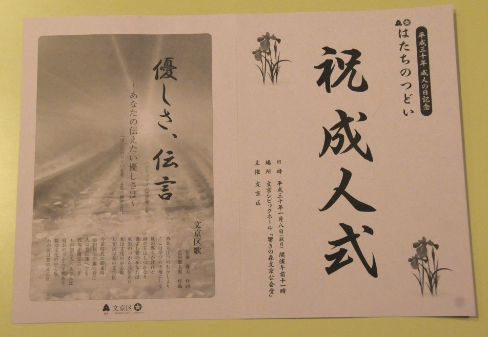 1月14日の成人の日に、文京シビックホール大ホールで、平成31年成人の日記念「はたちのつどい」を開催します。今回の「はたちのつどい」の対象者は、平成10年4月2日~平成11年4月1日生まれの文京区在住者、1,990人(平成30年12月1日現在)です。 「はたちのつどい」は、新成人と文京区による実行委員会「はたちのつどいを考える会」が、時間をかけて、その内容を検討してきました。文京区長などからの祝辞をはじめ、湯島天神太鼓保存会による祝い太鼓や、歌手の川嶋あいさんの成人の日記念ライブが行われます。 【新成人自らが「はたちのつどい」をプロデュース】