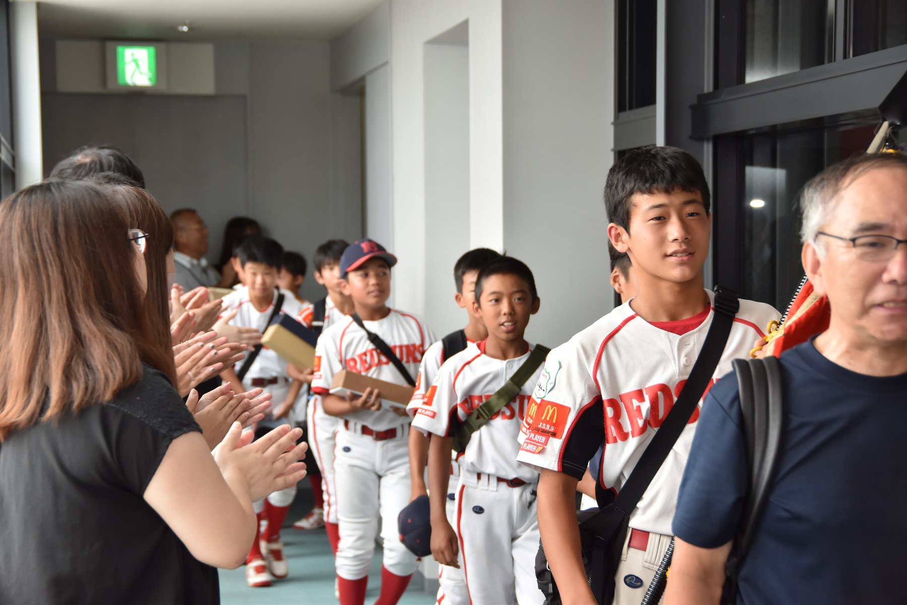 8月21日(月曜日)、「高円宮賜杯第43回全日本学童軟式野球大会マクドナルド・トーナメント」において、区内で活動する「レッドサンズ」が第3位となり、副代表、監督、選手が報告のために来庁し、合わせて区より、今大会の結果を称するため表彰を行いました。