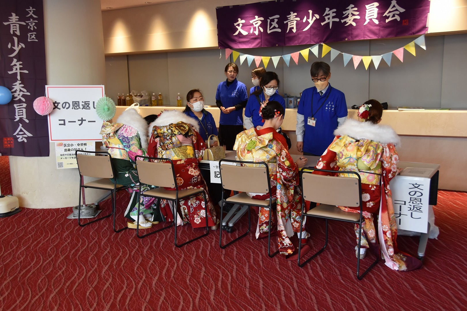 式典では、文京区長などからの祝辞をはじめ、湯島天満宮白梅太鼓保存会による祝い太鼓や、シンガーソングライターの足立佳奈さんによる「成人の日記念ライブ」が行われました。