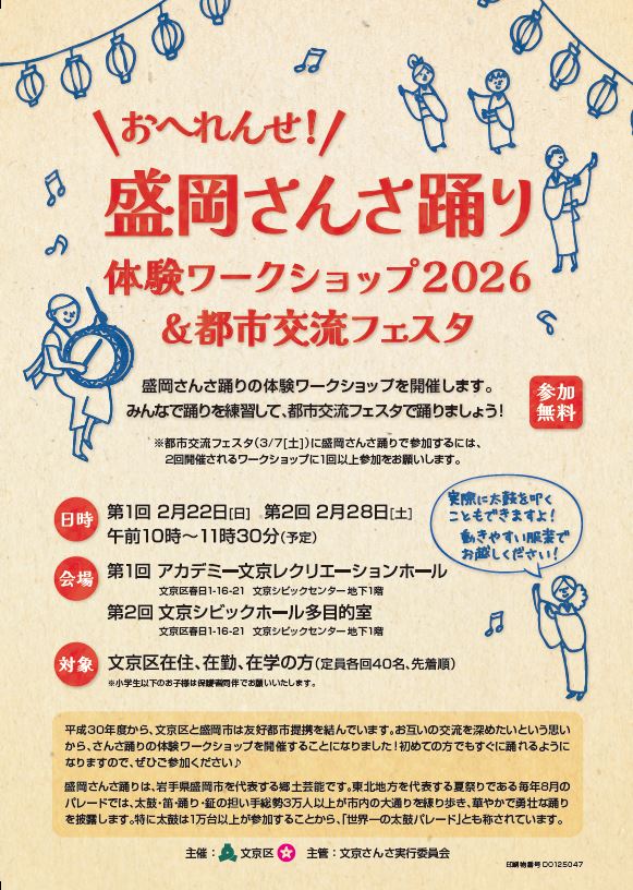 盛岡市と文京区は、それぞれが石川啄木「生誕の地」と「終焉の地」であることを縁に、交流を深めてきました。「盛岡さんさ踊り」を通じて盛岡市の伝統芸能を楽しみながら体感できる、体験ワークショップを開催します。盛岡でも、初めての方が祭り当日に練習し、そのままさんさ踊りパレードに参加する「さんさおへれんせ集団」というものがあります。初めての方もすぐに踊りを覚えることが出来ますので、ぜひご参加ください!