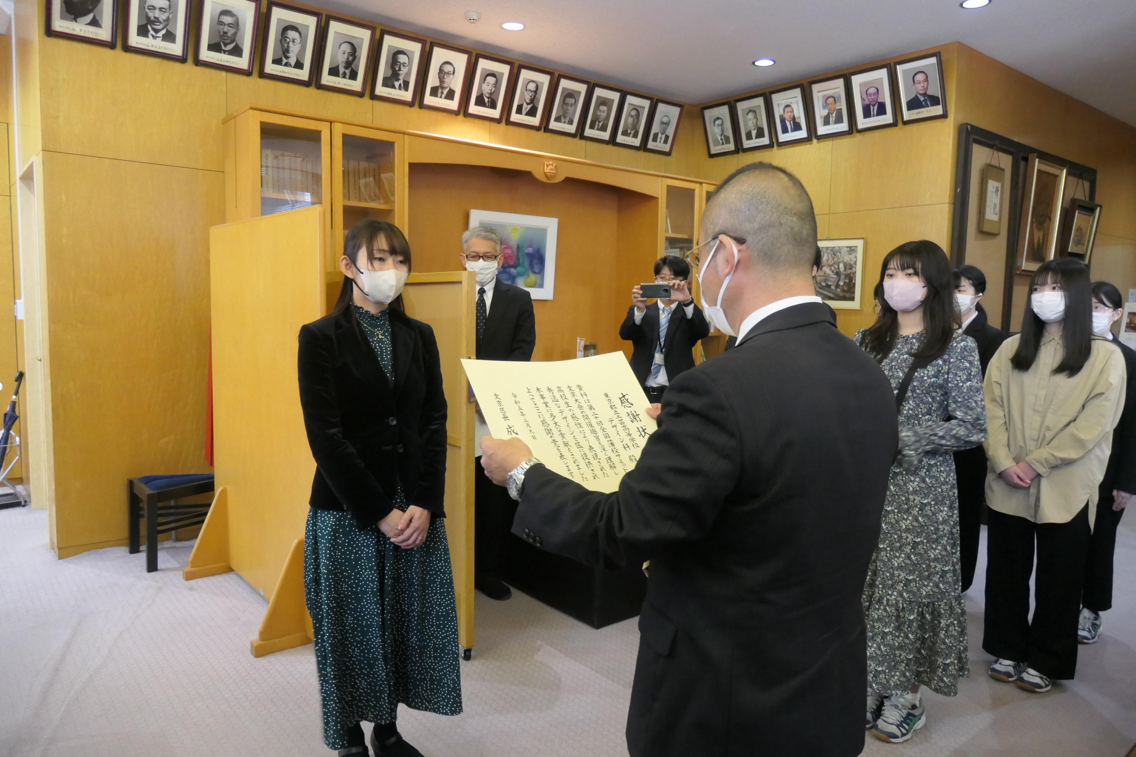 制作・ご提供いただいた作品は、高校生の感性により表現された秀逸なデザインであり、「第20回全国藩校サミット文京大会」の開催に向けて多大な貢献をいただいたことから、令和5年3月9日(木曜日)、都立工芸高校デザイン科及びデザイン採用者2名に対し、感謝状の贈呈を行いました。