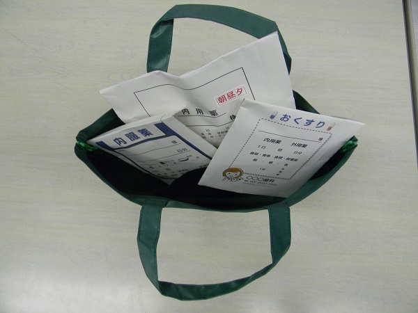 病院で処方された薬を配布薬局で「ぶんきょうお薬バッグ」に入れてお渡しします。