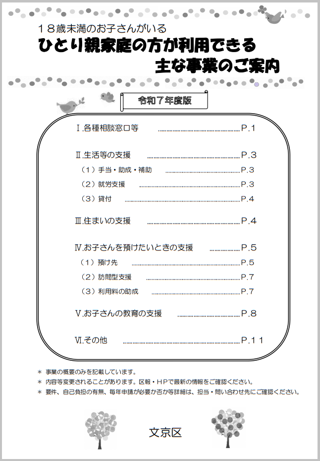 「ひとり親家庭の方が利用できる主な事業のご案内」は、18歳未満のお子さんがいるひとり親家庭の方がご利用できる相談窓口や支援制度などの情報を掲載しています。